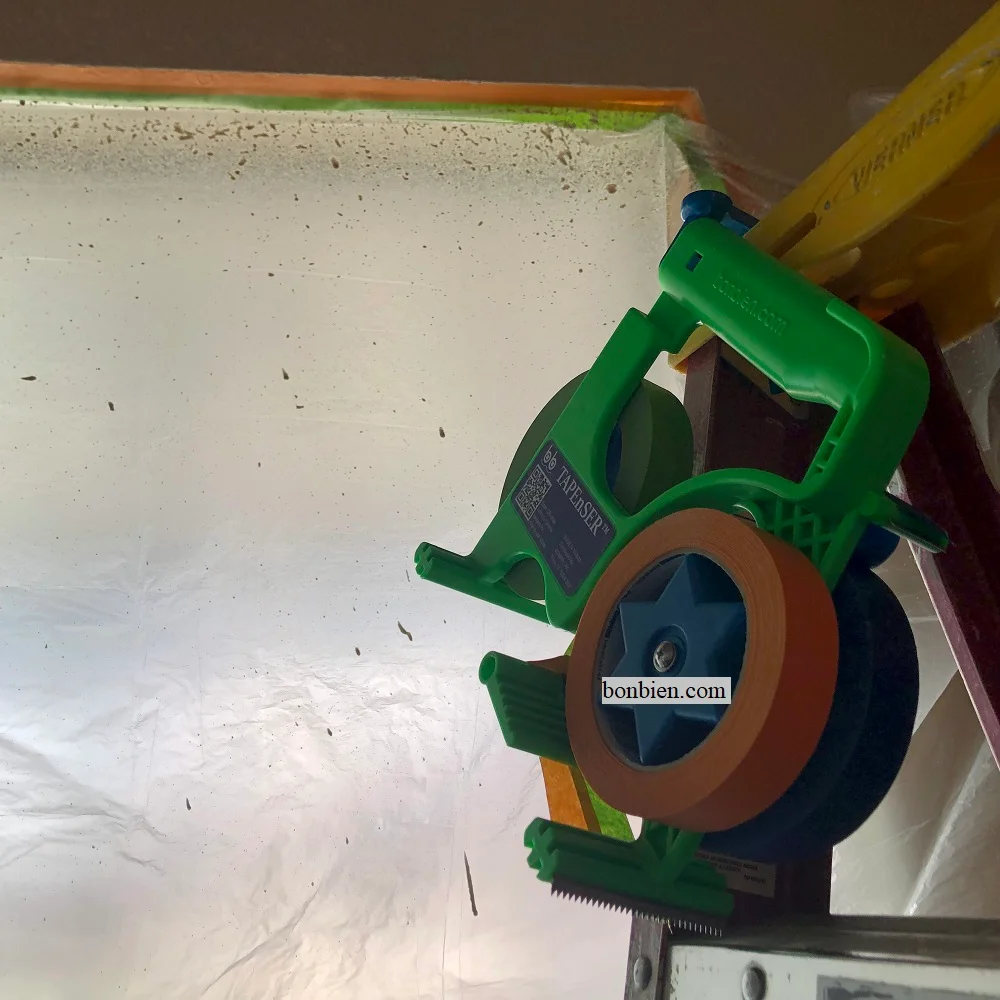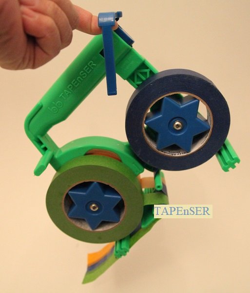TAPEnSER is an innovative tape dispenser that aligns 2 or 3 tape rolls, producing double or triple reverse-conjoined tape strips for attaching plastic sheeting and paper to mask surfaces or seal off spaces... Preventing overspray, mist, drip, and dust. Ideal for preparing surfaces for primer, paint, stain, texture, or plaster, and for isolating work areas to prevent dust from spreading. It is also ideal for auto body painting and can be used in offices, schools, and at home for posting notes, photos, drawings, bulletins, etc.